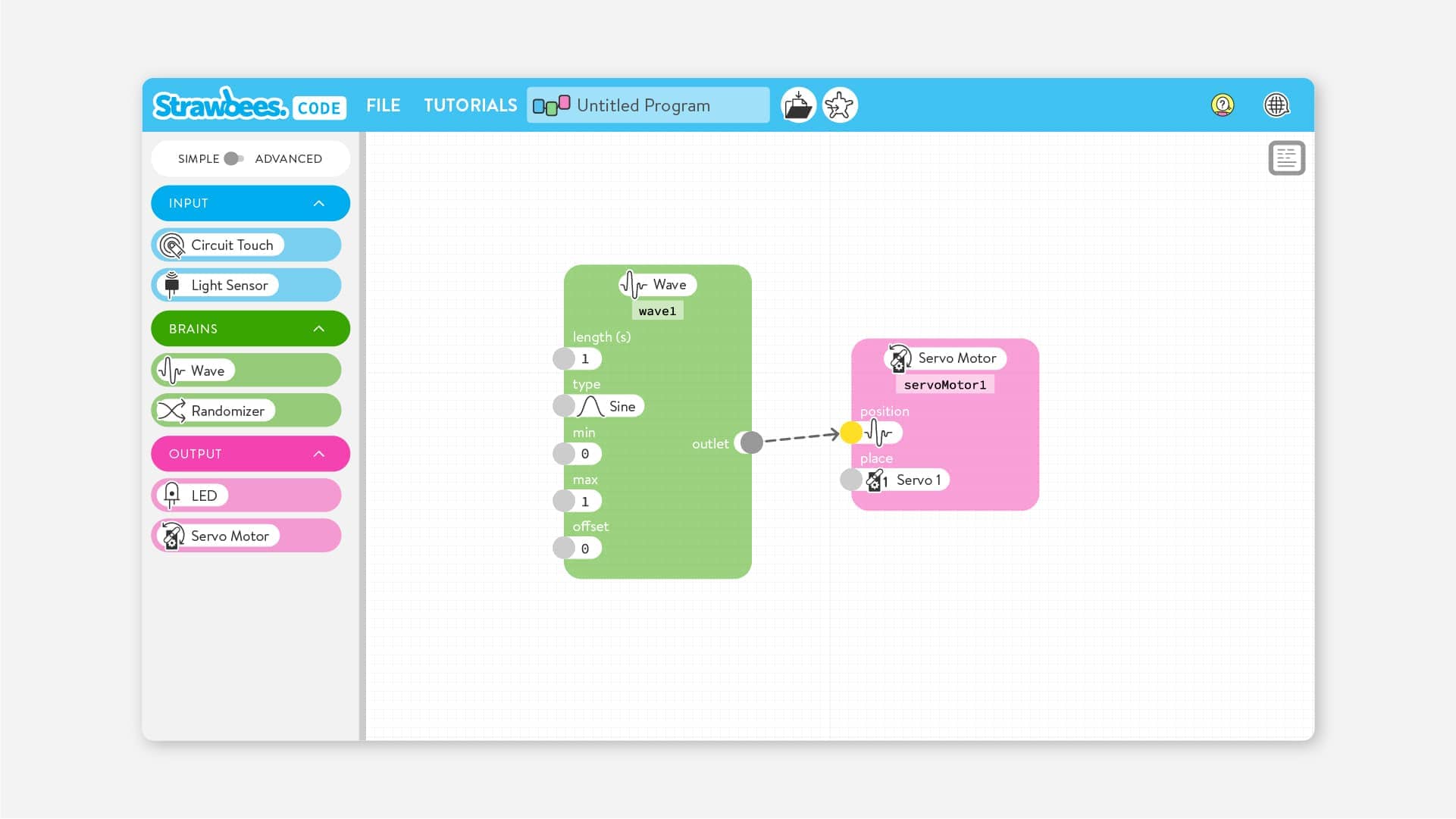 A waveform generator. Create a wave that oscillates (continuously swings back and forth) between two numbers. There are a number of different Waveforms (types of waves) that can be selected. The Wave node can be used in many situations like moving a servo motor back and forth, blinking an LED, or iterating through a list from the List node.