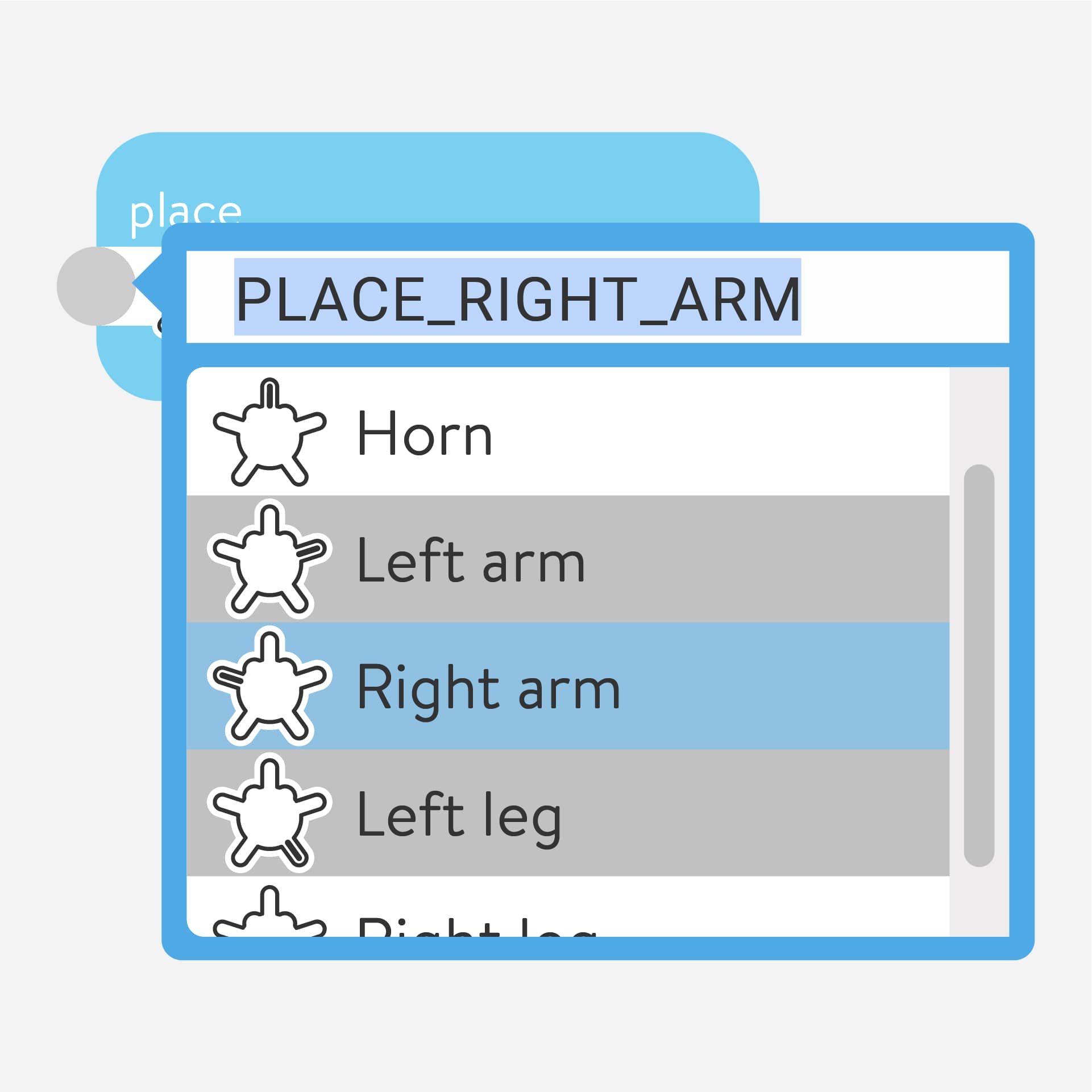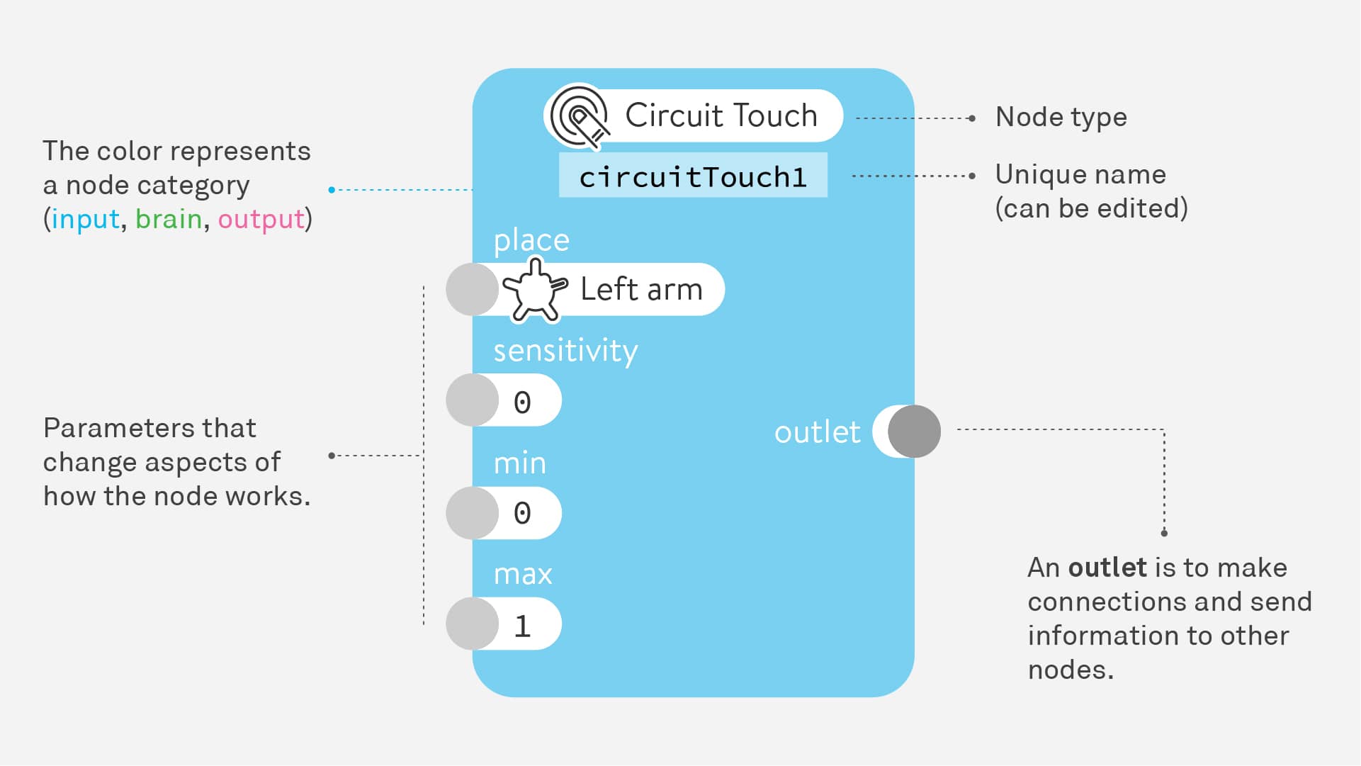 Many input and output nodes have a place option parameter (horn, left arm, right arm, left leg, or right leg) that presents where they exist in the physical world.