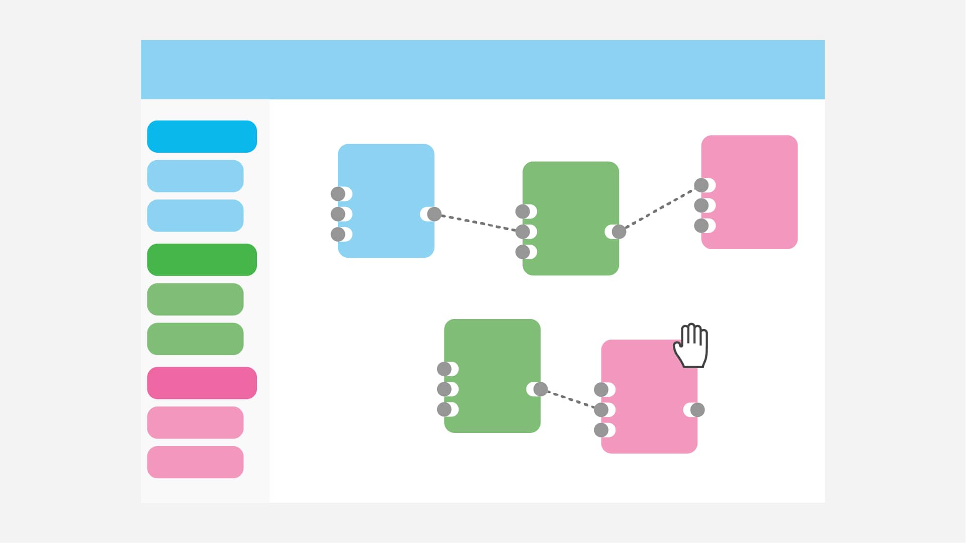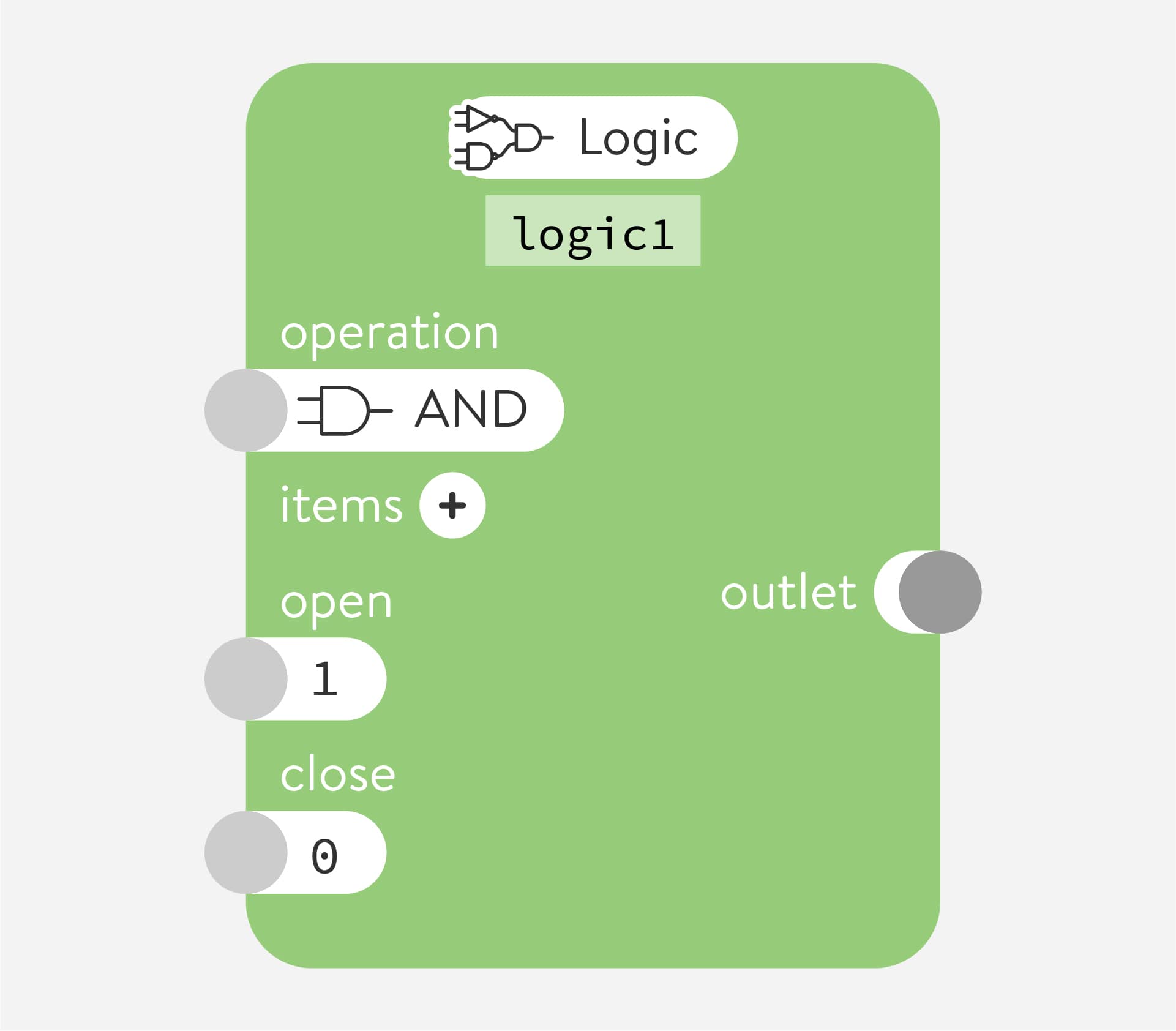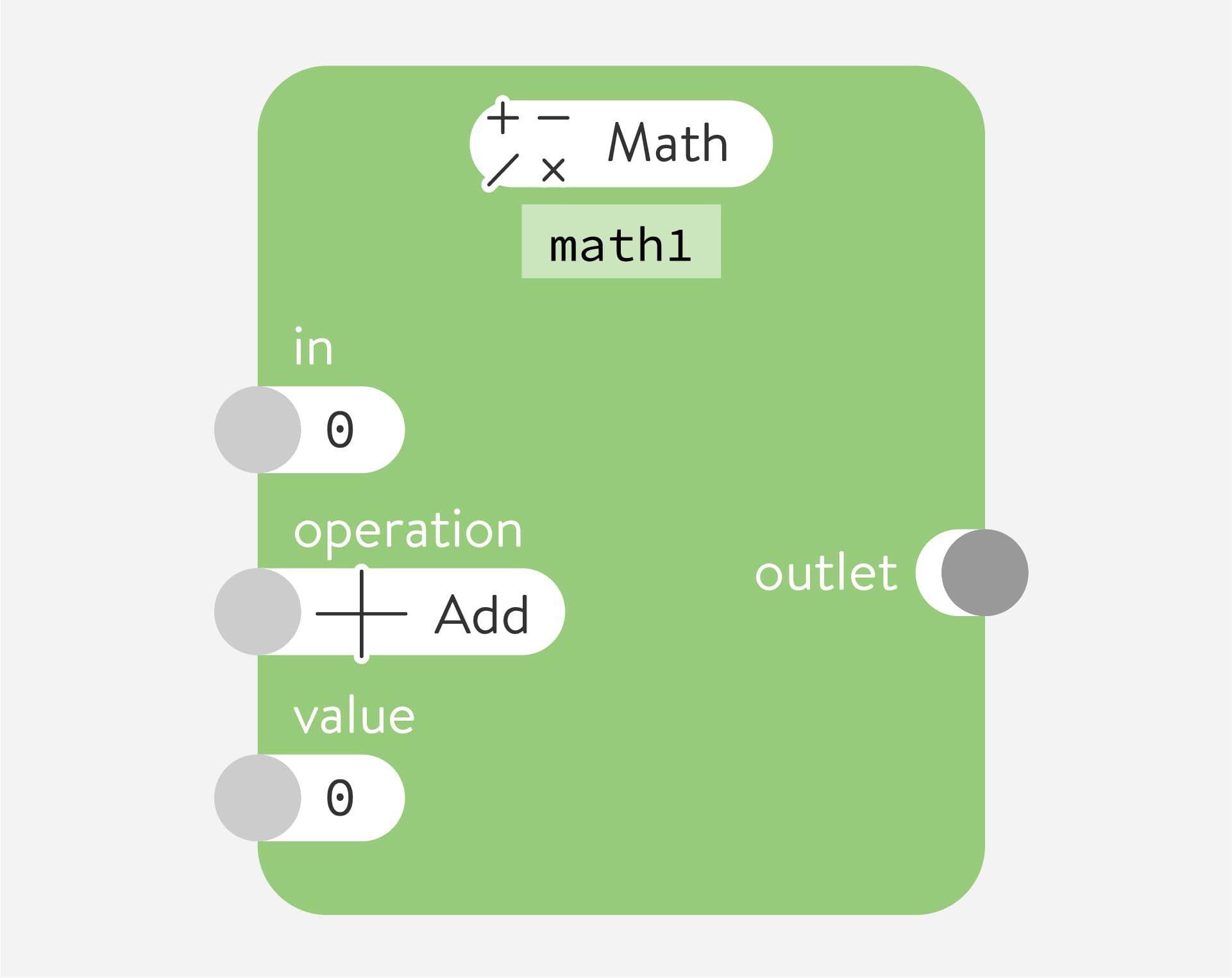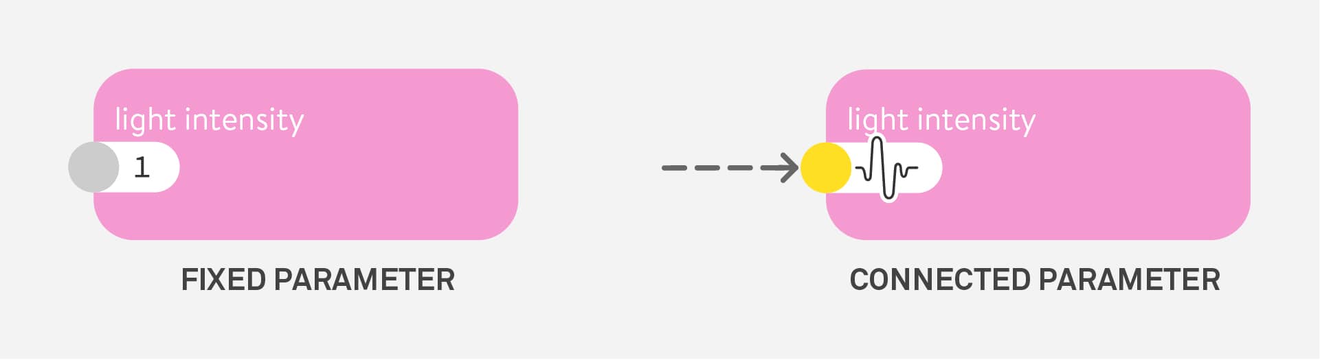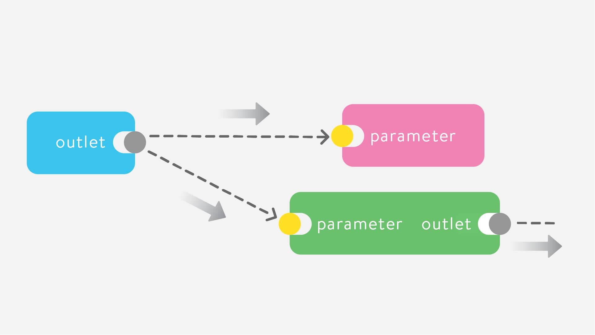 Connections send data from one node to another. Make a connection by dragging the outlet of a node and dropping it in the parameter of another node. Once connected, data flows continuously from the outlet to the parameter.