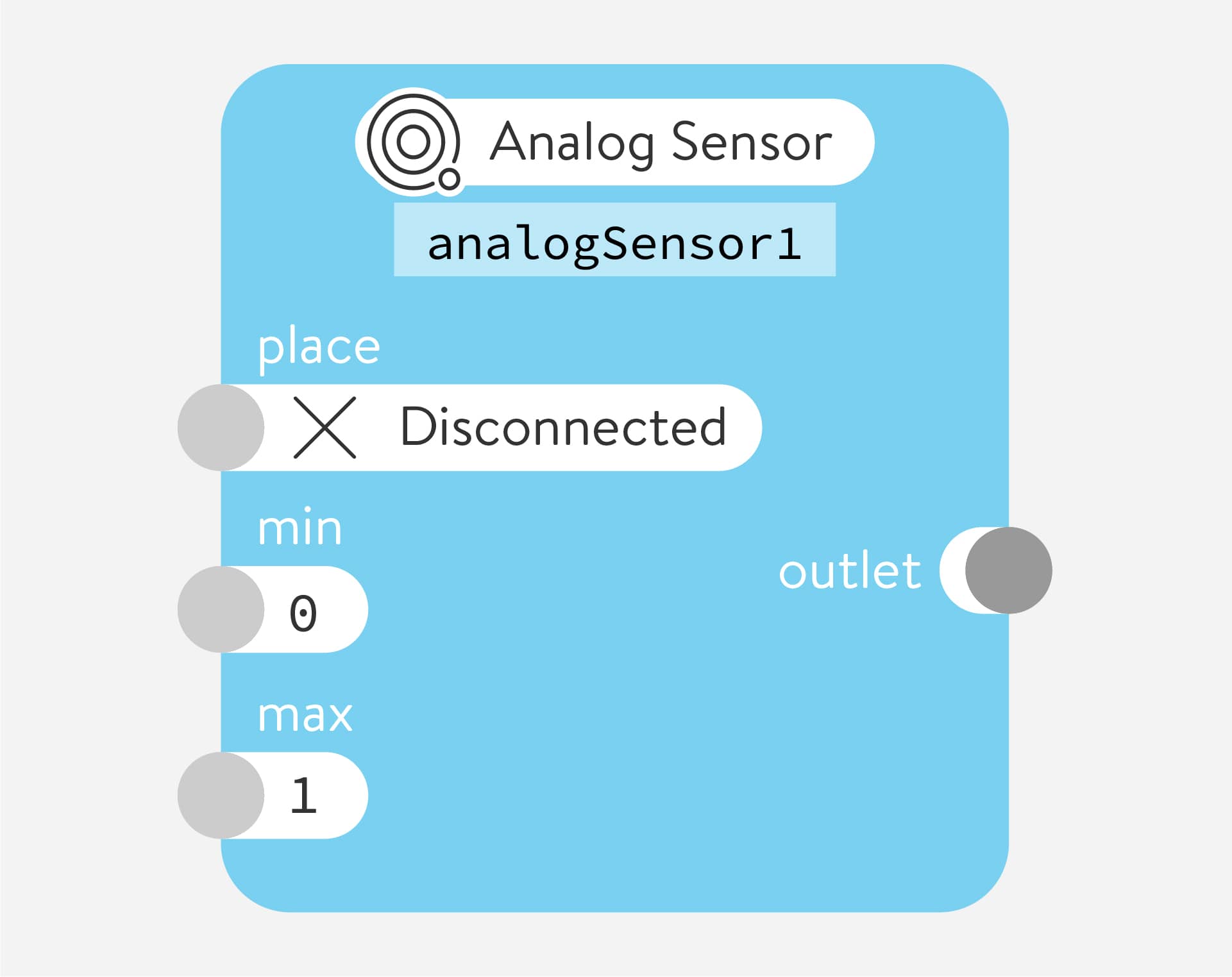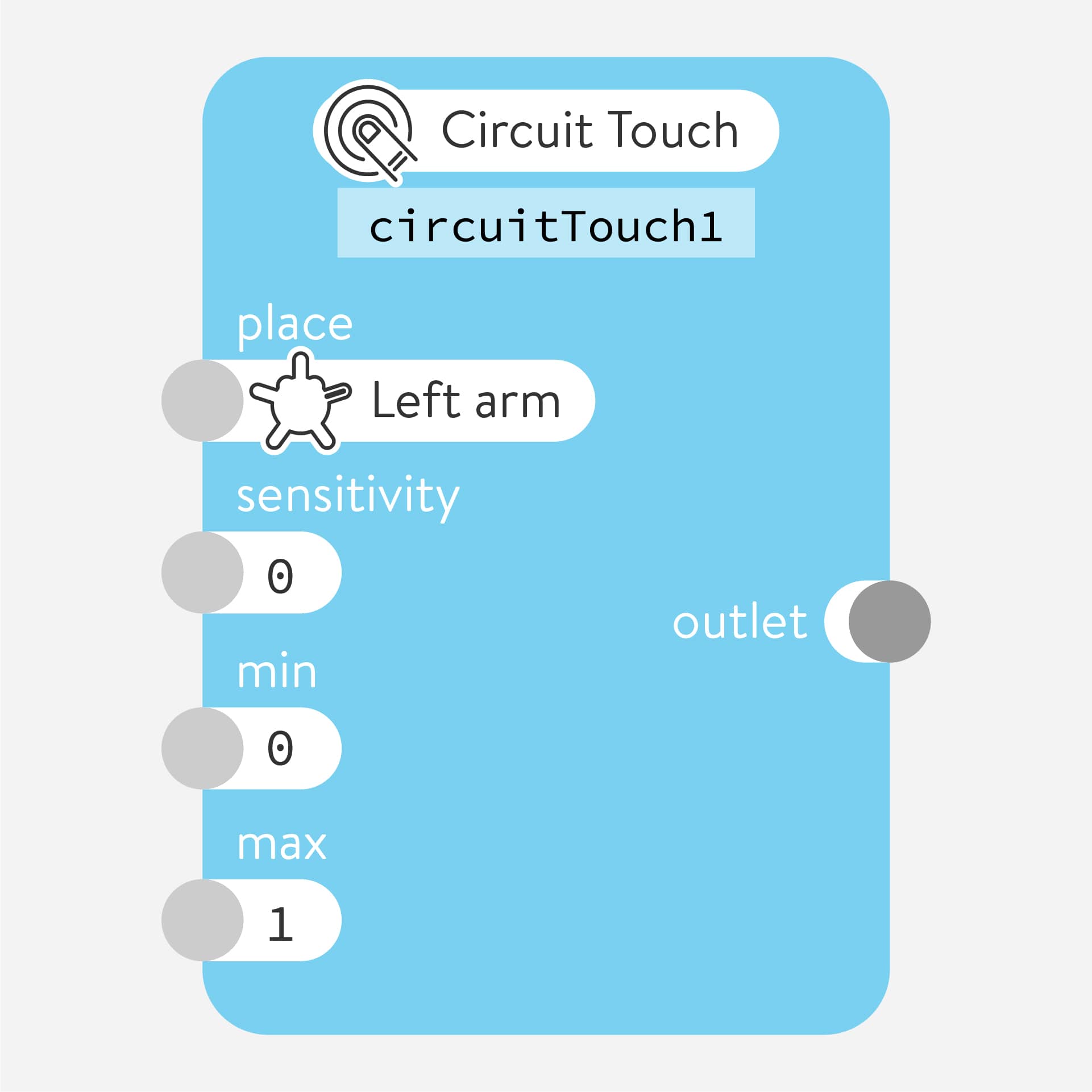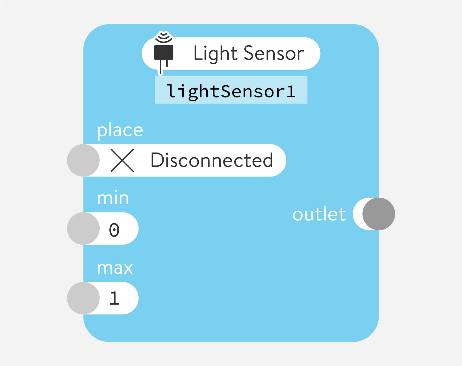 Reads an analog value from a physical light sensor connected to the arms, legs, or horn of the Quirkbot. It gives the light sensor power from the front pad and reads the back pad to determine the amount of light hitting the sensor. It also works with other sensors based on resistance.