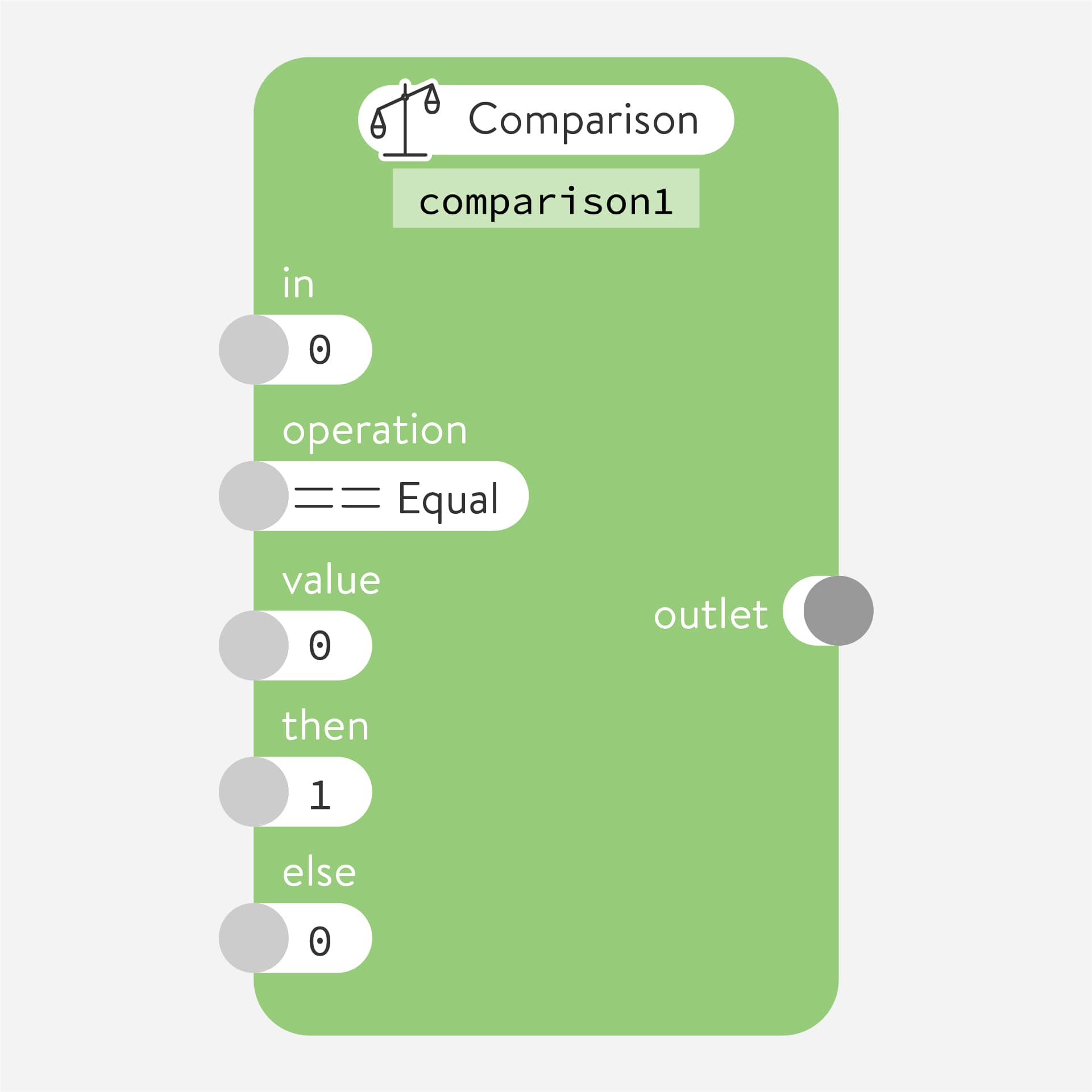 Compares two values and evaluates the result. The number going to in is compared to the number in value, and the type of comparison is selected with operation. If the result of the comparison is “true” (for example if in is 1, operation is == Equal, and value is 1) then the number in then is sent to the outlet. If the comparison is “false” (for example, if in is 0, operation is > Greater, and value is 1) the number in else is sent to the outlet. This is a powerful node that can be used in many ways.