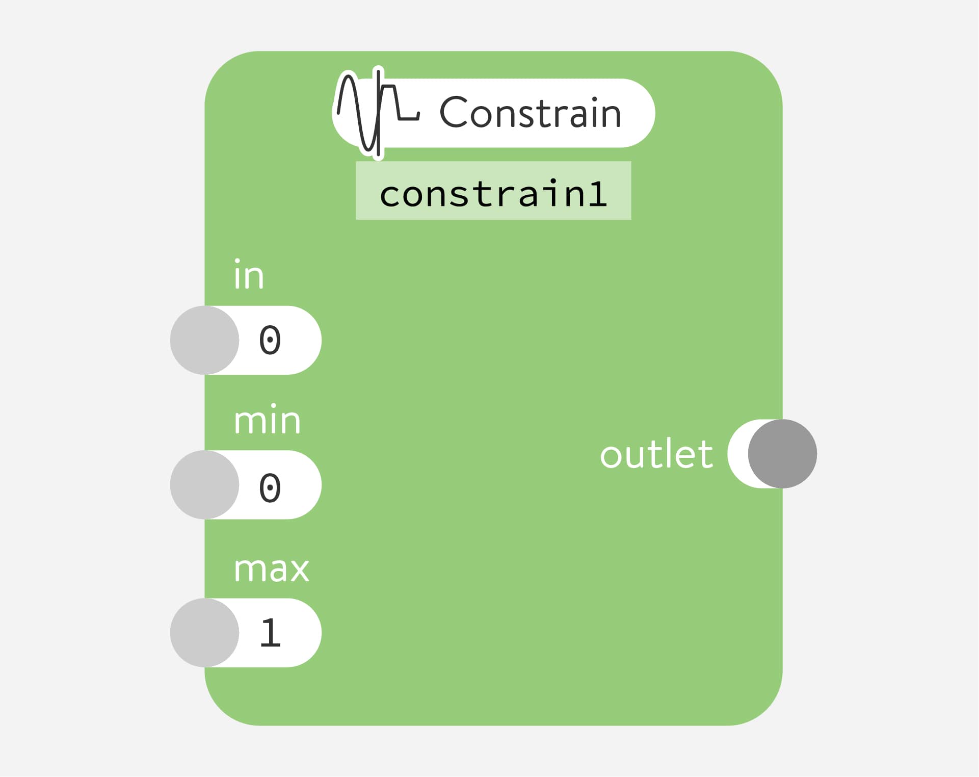 Constrain any number to be kept inside a limited range. The number sent to in will go unchanged to the outlet if it lies between the values in min and max. If it’s higher than max then max will be sent to the outlet. If it’s lower than min then min will be sent to the outlet.