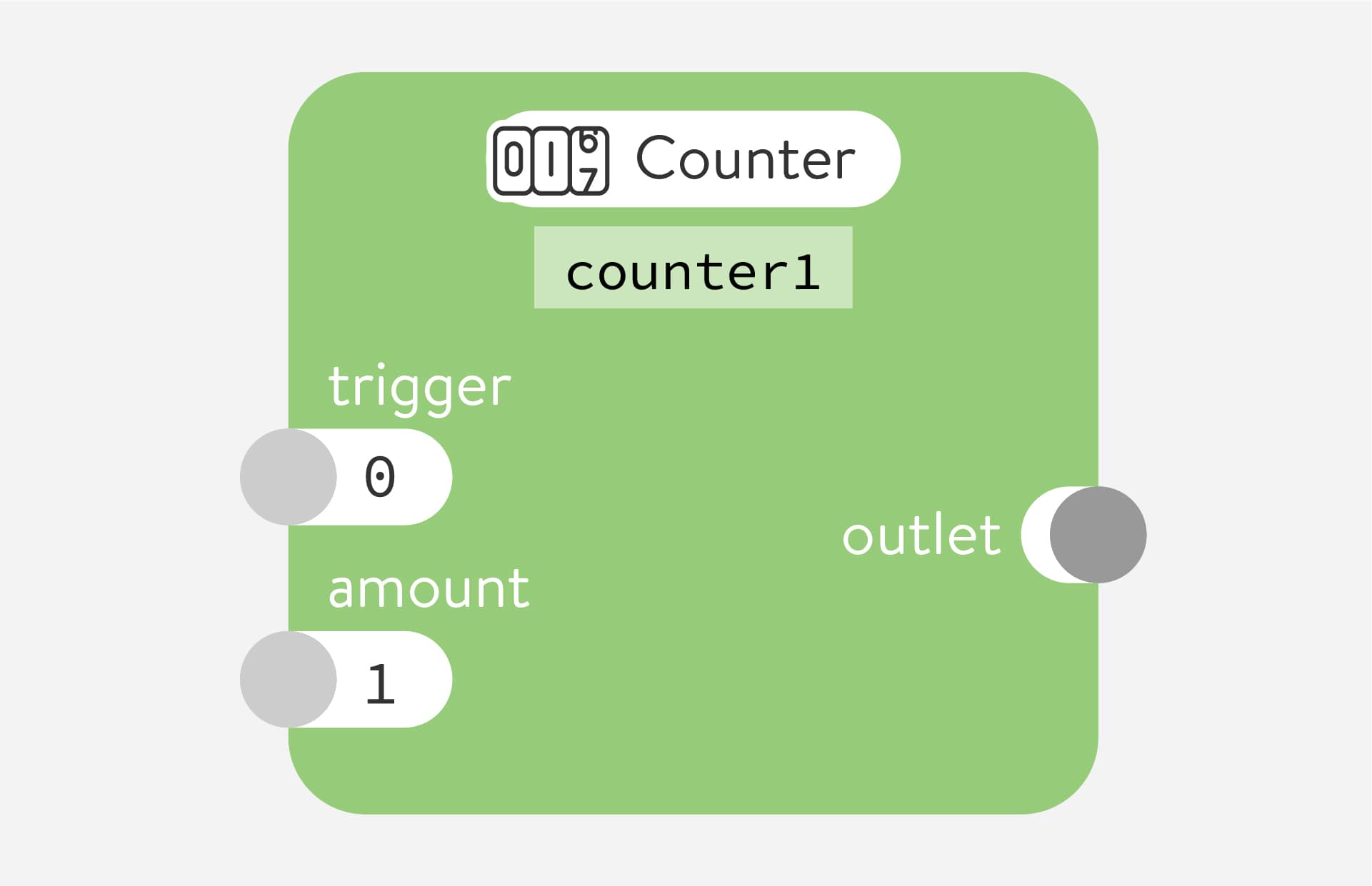 Counts from 0 by a certain amount every time it receives a trigger pulse. There is currently no way to reset the counter.