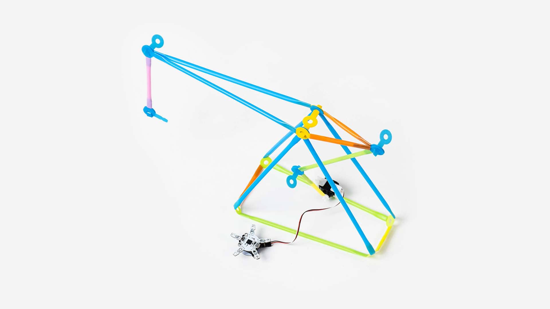 Lift cargo with a robotic crane operated with circuit touch. In many robotic and automated creations, the movement of the motor matches the expected result perfectly. When first making the crane, the movement of the mechanical structure will not be perfect the first time. Explore how to get different results of the crane’s automated movement by changing the motor, the code controlling the motor, and adjust the movement of mechanical structure.