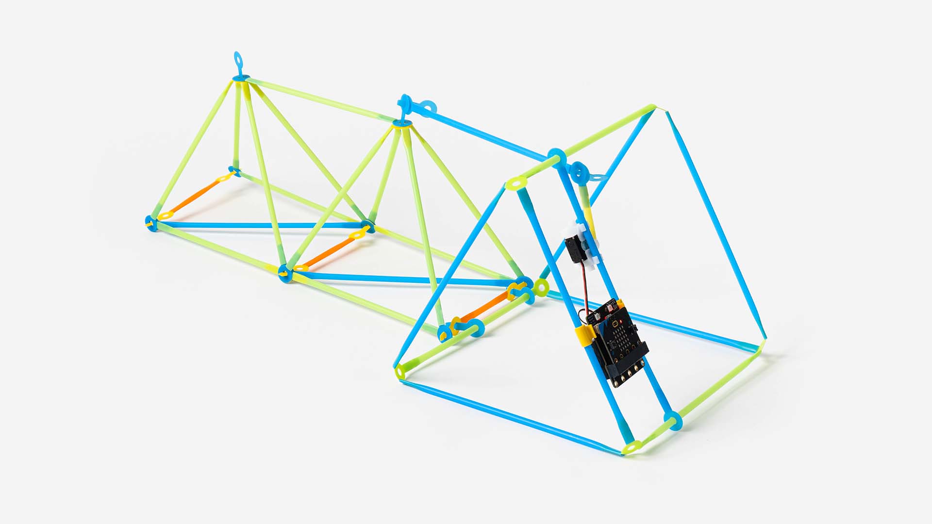 The drawbridge handles safe passage for boats to travel through the river canals, halting car traffic in the process. Using micro:bit V2, the microphone listens for noise, such as a clapping sound. When successfully heard, the servo motor pulls the mechanical linkage lifting the bridge, clearing for waterway traffic. The Robotics board also acts as the weight to provide stability as the drawbridge eventually lowers.