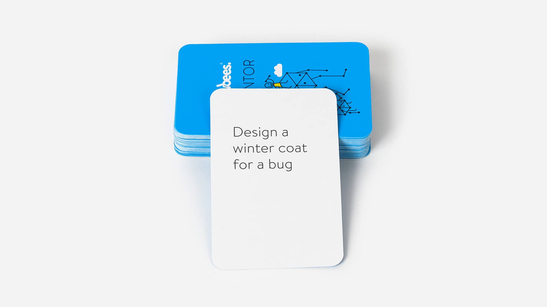 Tailor a coat specifically for a bug, incorporating miniature insulation and weather-resistant materials for winter protection. Observe Fanny's design process for the selected challenge card from the Pocketful of Ideas deck.