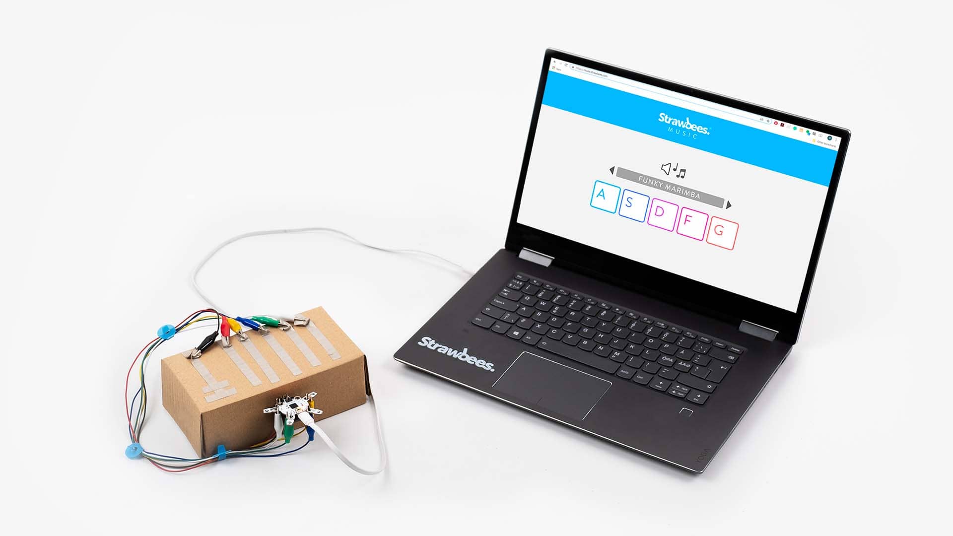 Build an instrument with construction materials, connect to the computer, and play sounds using the key press interaction to trigger sounds played from the computer. The buttons themselves also can be made as a larger surface for pressing the keys of the instrument instead of pinching the Quirkbot's legs and arms. You can grip the ends of the alligator cables on conductive materials like copper tape, aluminum foil, pots, or anything else made of metal!